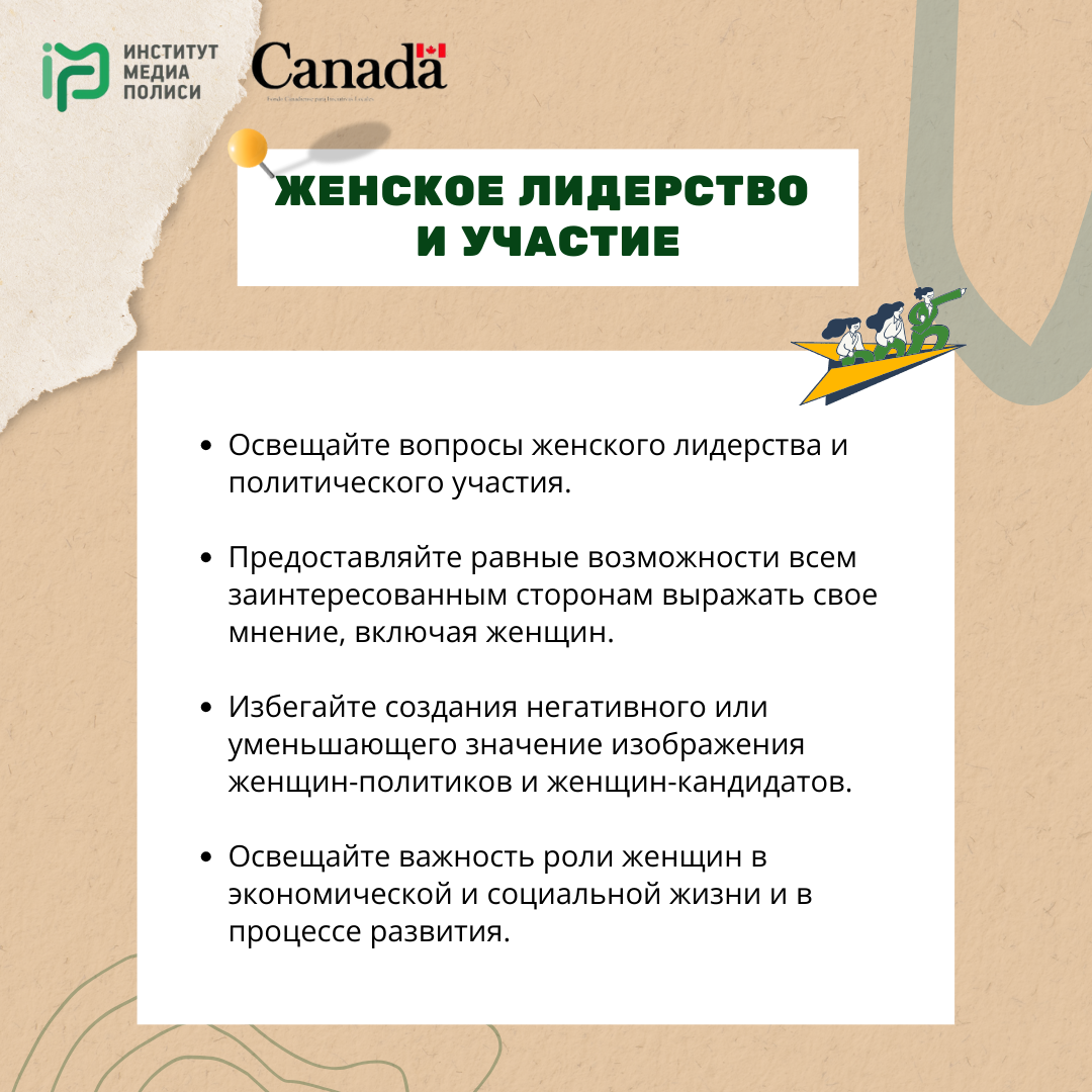 Освещайте вопросы женского лидерства и политического участия. Предоставляйте равные возможности всем заинтересованным сторонам выражать свое мнение, включая женщин. Избегайте создания негативного или уменьшающего значение изображения женщин-политиков и женщин-кандидатов. Освещайте важность роли женщин в экономической и социальной жизни и в процессе развития.